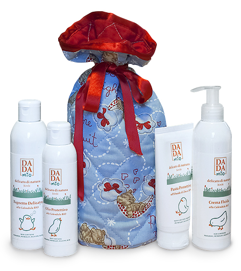 La confezione in tessuto trapuntato, realizzata a mano in Italia, contiene i seguenti prodotti della linea Pelli Sensibili: 1x Bagnetto delicato alla Calendula Bio, 1x Crema fluida alla Calendula Bio, 1x Olio protettivo alla Calendula Bio e 1x Pasta protettiva osssido di zinco 10%