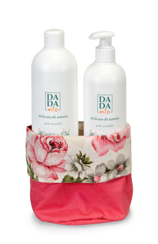 La confezione in cotone, realizzata a mano in Italia, contiene i seguenti prodotti della linea Pelli Sensibili: 1x Crema corpo idratante e 1x Olio doccia